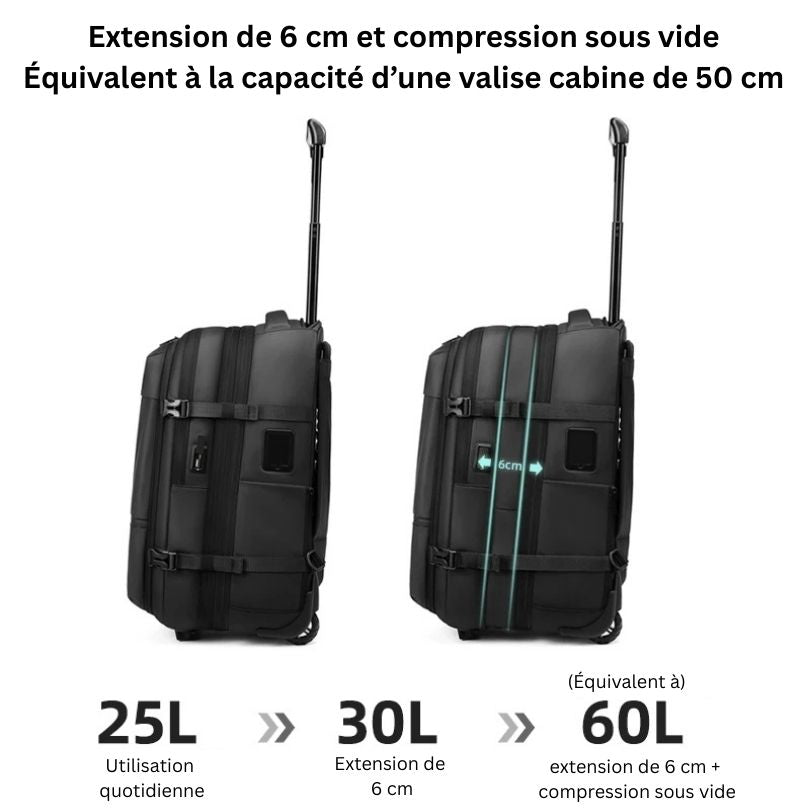 La capacité est flexible, allant de 56 à 75 litres grâce à son compartiment extensible. Vous adaptez l’espace selon ce que vous emportez, sans perdre en praticité.